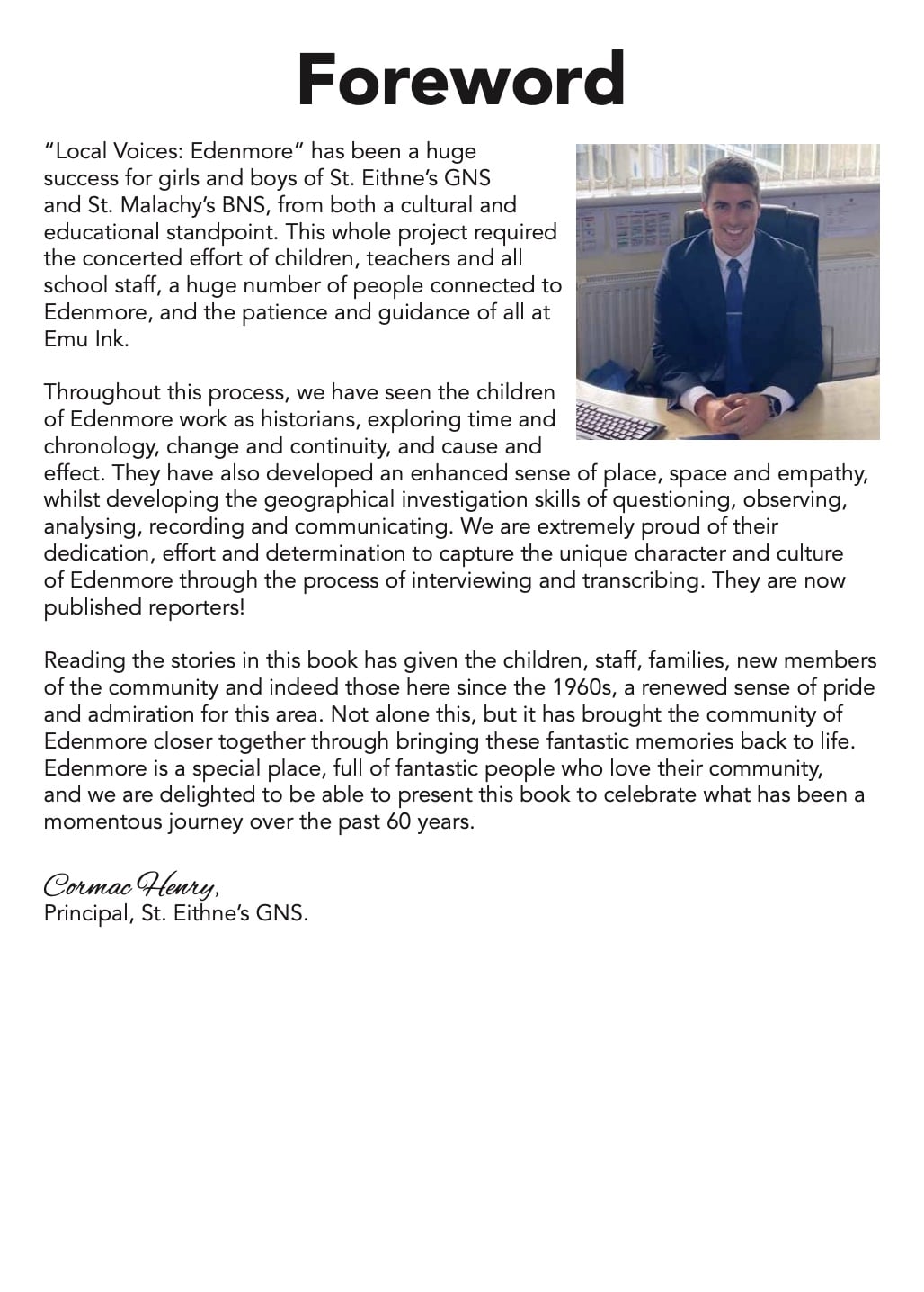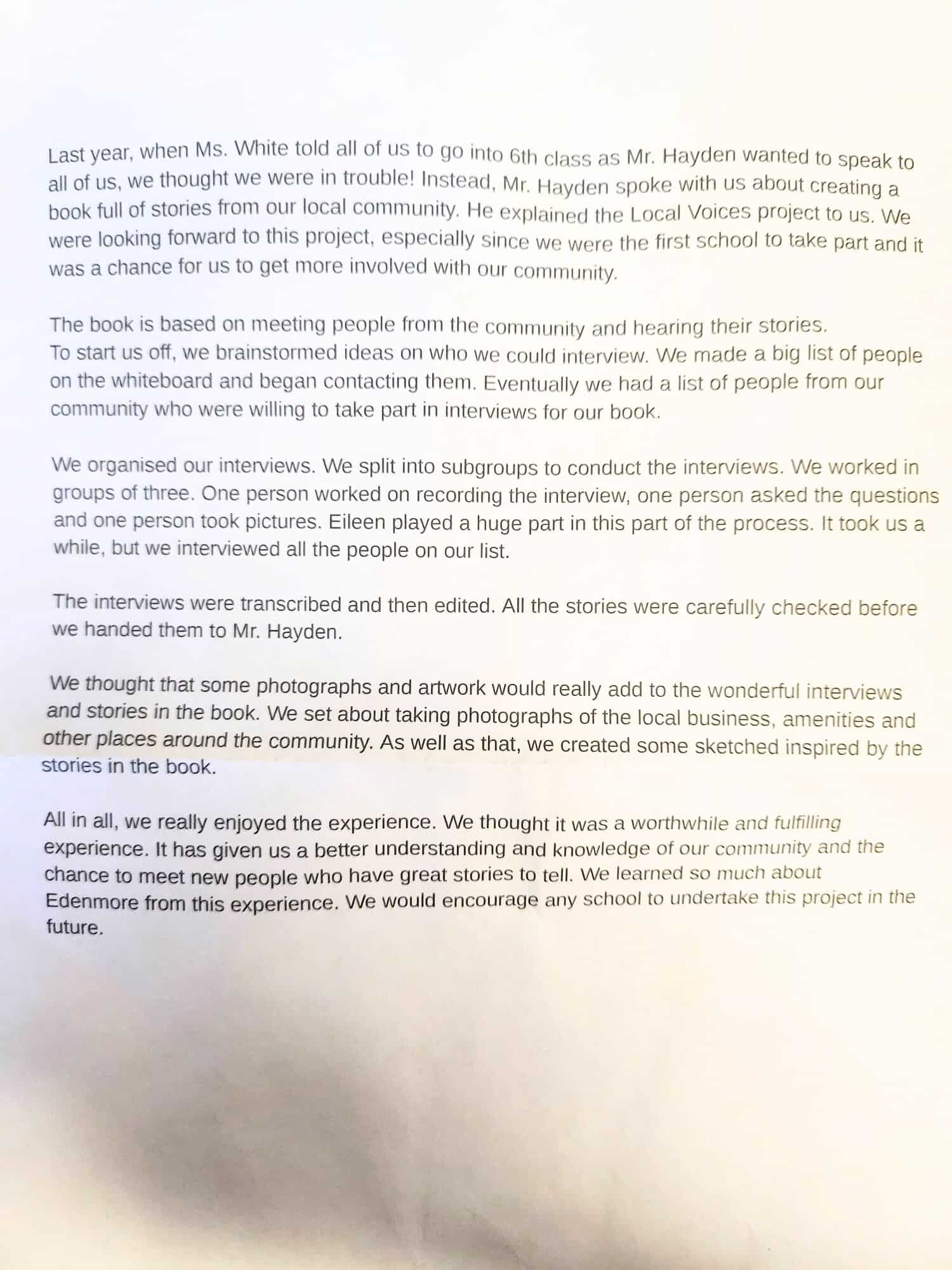 Local Voices allows pupils to become the researchers, interviewers and authors of their own historical book. The pupils undertake an examination of the recent history and contemporary geography of their locality, interview locals from their community, and transcribe these interviews for the book – adding new and historical photographs, supporting artwork and relevant newspaper clippings. In undertaking this project, the children develop a rich sense of place in their locality and pride in their community. The publication becomes a great source of pride to the school and the community; and a rich resource for future local studies and citizenship education.