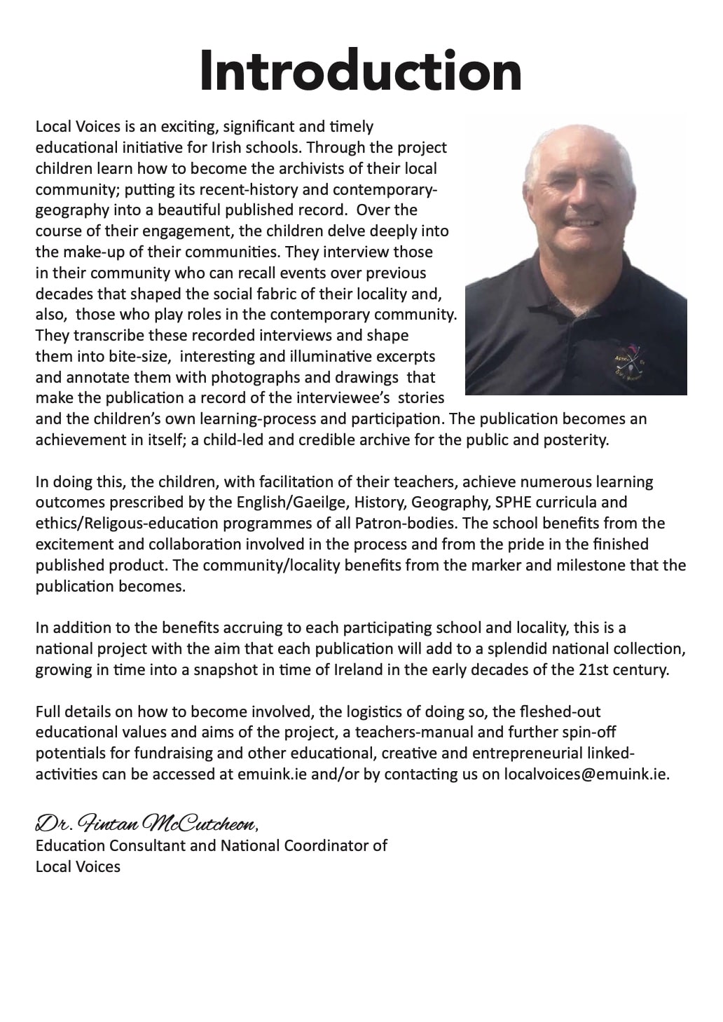 Local voices is an exciting, significant and timely educational initiative for Irish schools. Through the project children learn how to become the archivists of their local community; putting its recent history and contemporary geography into a beautiful, published record.